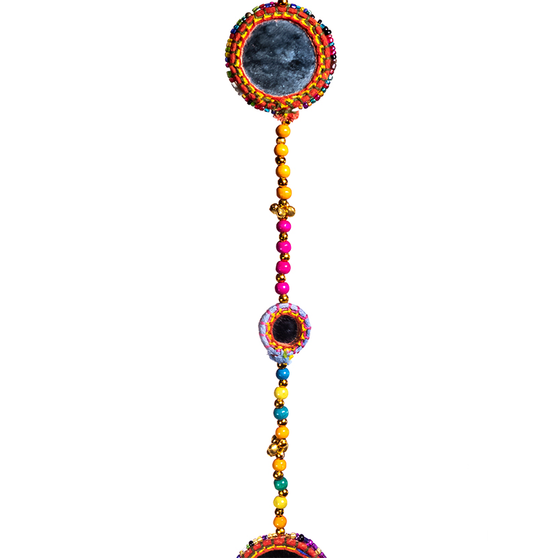 Kleurrijke slinger met spiegeltjes en belletjes, ter decoratie op de kinderkamer of elders in huis. Lengte 85-93 cm en verpakt per 2 stuks.