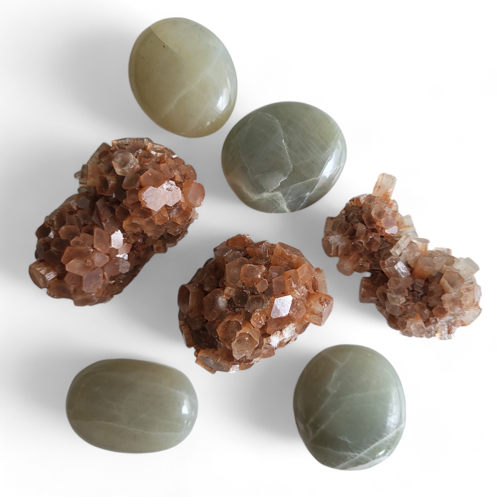 Set van 1x Groene Maansteen Zaksteen 4-5cm en 1x Aragoniet Cluster 4-6cm. Voor gebruik bij meditatie, op altaar etc. Lees meer over deze combinatie op ons blog.