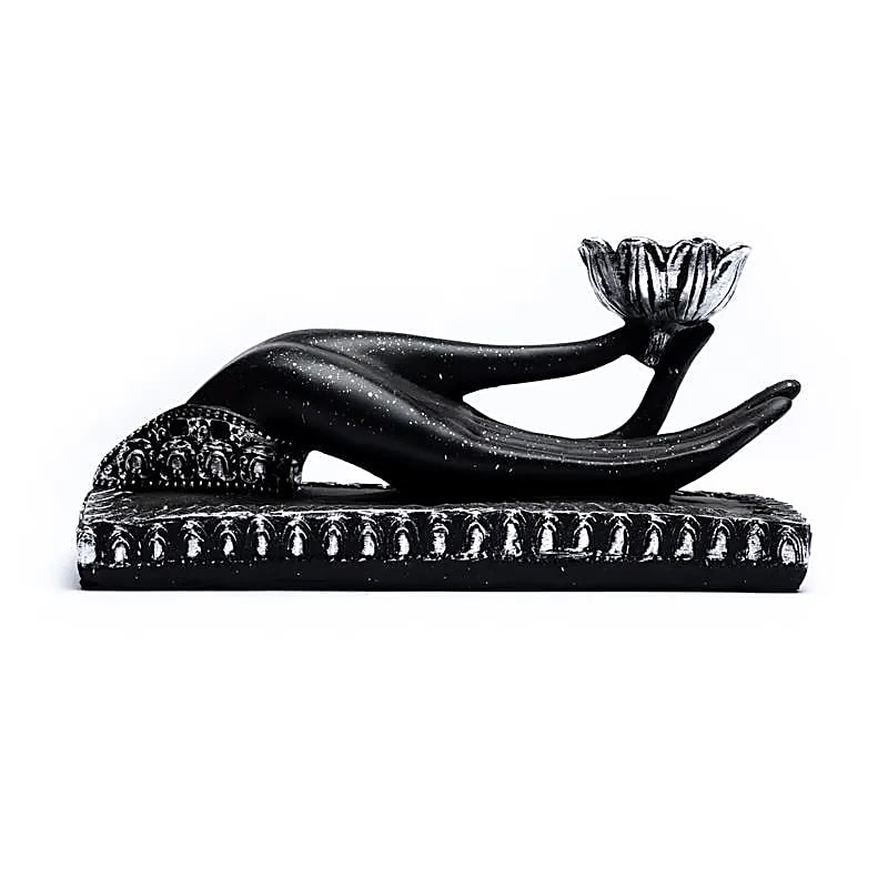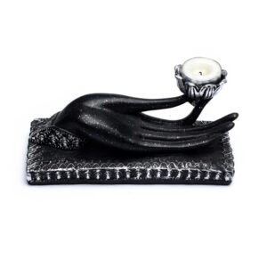 Een waxinelicht wordt gedragen door een hand in de zogenoemde Gyan Mudra, een van de meest bekende handmudra’s (vrede, hart, zelfvertrouwen, zuiverheid). Prachtige vormgeving.