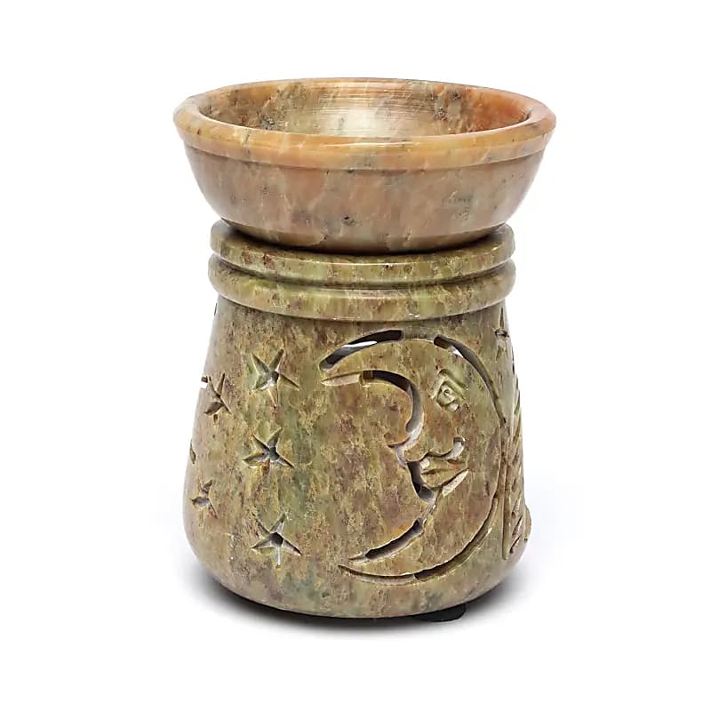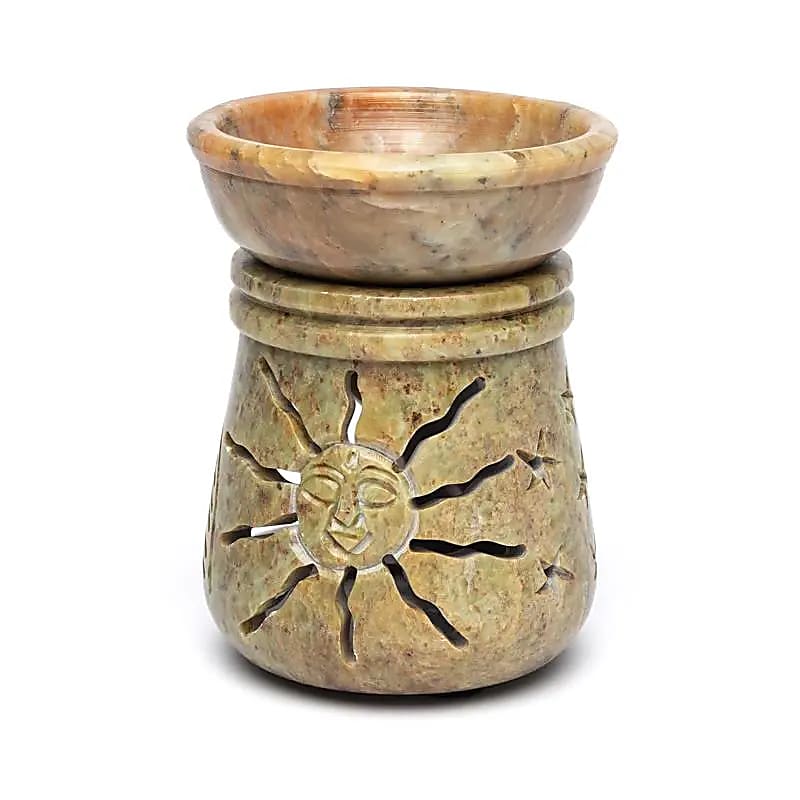Olieverdamper van natuurlijke zeepsteen met een opengewerkt zon- en maanmotief. Een compacte brander voor het verdampen van etherische oliën met behulp van een waxinelicht.