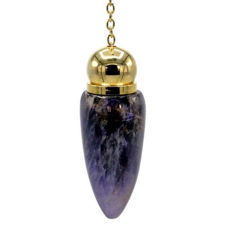 Pendel Amethist met messing vergulde top en kamer. De pendel kan worden opengeschroefd, zodat je er iets in kunt doen.
