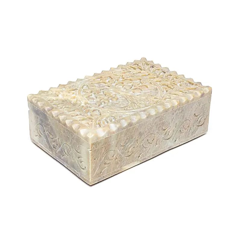Tarot- of sieradendoos van natuurlijke zeepsteen, voorzien van een verfijnd uitgesneden Levensboom-motief in het deksel. Geschikt voor het opbergen van tarotkaarten, sieraden of andere kleine waardevolle items.