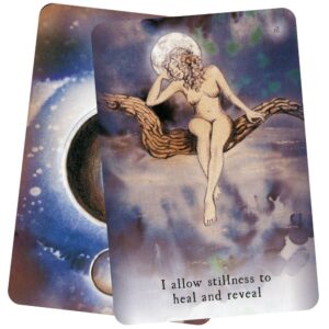 The Moon Deck comes housed in a handcrafted wooden box, made from sustainably harvested mango wood in India. Each box is unique, varying slightly in color, texture, and design, adding a sacred and elegant touch to home décor. The wooden box not only serves as a beautiful storage solution but also enhances the deck’s charm and character.